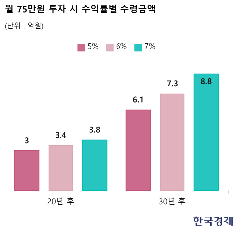 이는 월 75만원씩 적립식으로 투자한다면 충분히 마련할 수 있는 금액입니다. 30년간 연평균 7% 수익률을 낸다면 수령액은 8억8230만원에 달합니다. 연금저축과 IRP(개인형 퇴직연금)를 합해 연 900만원까지는 세액공제 혜택도 누릴 수 있습니다. 직장인이라면 매년 적립되는 퇴직연금이 있어 매달 필요한 투자금이 더 줄어들게 됩니다.