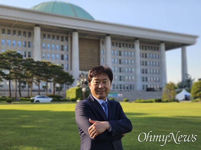 | ▲ 13일 오후 황명선 더불어민주당 국회의원(충남 논산·계룡·금산) 당선인이 서울 영등포구 국회의사당 본관 앞에 마련된 농성장 앞에서 <오마이뉴스>와 만나 인터뷰하고 있다. |