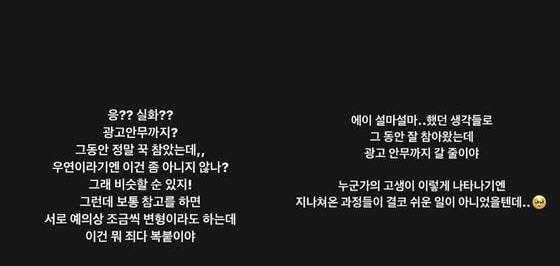 또 '쿠키(Cookie)', '슈퍼 샤이(Super Shy)' 등의 안무를 제작한 퍼포먼스 디렉터 블랙큐도 "설마했던 생각들로 그동안 잘 참아왔는데 광고 안무까지 갈 줄이야. 누군가의 고생이 이렇게 나타나기엔 지나쳐온 과정들이 결코 쉬운 일이 아니었을 텐데.."라고 씁쓸한 마음을 드러냈다.