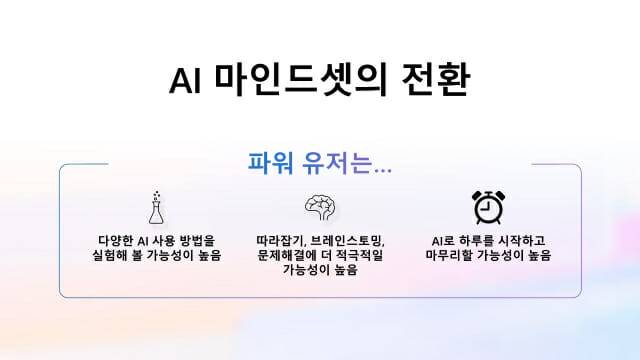 오 팀장은 “파워유저 그룹은 AI로 업무생산성을 어떻게 높이는지 샘플링할 수 있는 그룹”이라며 “파워유저는 AI로 더 많은 것을 시도하고, 그 결과를 여러 사람에게 전파하며, 회사 내 이슈 해결을 위한 업무에 더 적극적으로 참여하는 경향을 보인다”고 설명했다.