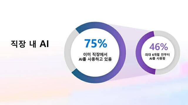 보고서에 따르면 전체 근로자 4명 중 3명이 직장에서 AI를 활용하고 있는 것으로 조사됐다. 근로자 75%(한국 73%)가 AI를 사용하고 있으며, 6개월 전부터 AI를 사용한 비율은 46% 증가했다. 리더의 79%가(한국 80%) AI 도입이 경쟁력 유지에 필수적이라고 인식하고 있으나, 이들 중 60%는(한국 68%) 조직 내 비전과 명확한 계획이 부족한 것에 대해 우려하고 있다고 답했다.