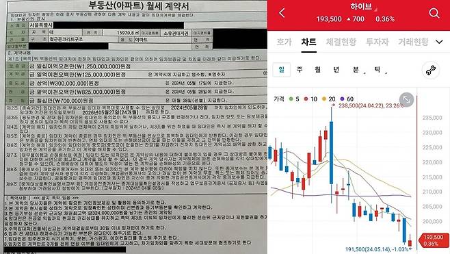 잔금 지급을 앞두고 목돈 마련을 위해 주식을 매도했다고 설명했다. 계약서상에 적힌 중도금 지급일은 오는 17일, 잔금 지급일은 오는 28일이다.