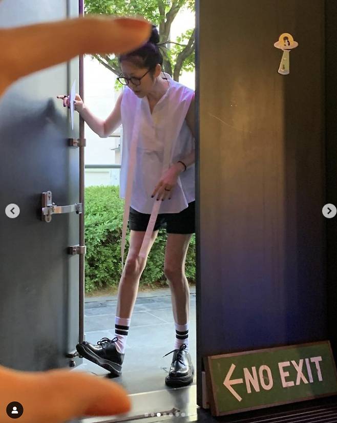 사진 속에는 고현정이 20살 이상 어린 모습의 스타일링으로 눈길을 끈다. 고현정은 똥머리에 안경을 쓰고 흰색 셔츠에 블랙 반바지, 다소 긴 타이즈로 포인트를 줬다.