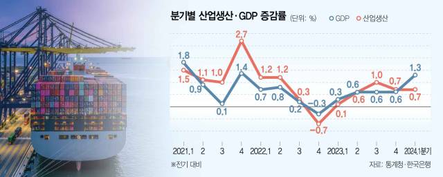 최근 올 1분기 국내총생산(GDP) 성장률 속보치와 산업활동동향 내 전 산업생산 수치가 연이어 발표된 뒤 시장에서는 혼란스럽다는 반응이 나왔다. 국내 경기 상황을 엿볼 수 있는 대표 지표인 3월 전 산업생산(-2.1%)과 1분기 GDP(1.3%)가 정반대의 모습을 보였기 때문이다. 전 산업생산은 분기로 봐도 0.7% 증가해 GDP 성장세보다 낮았다. 코로나19 이후에는 경기 후퇴 시기를 빼면 대체적으로 전 산업생산 상승률이 GDP보다 높았다는 것을 보면 이례적이다.