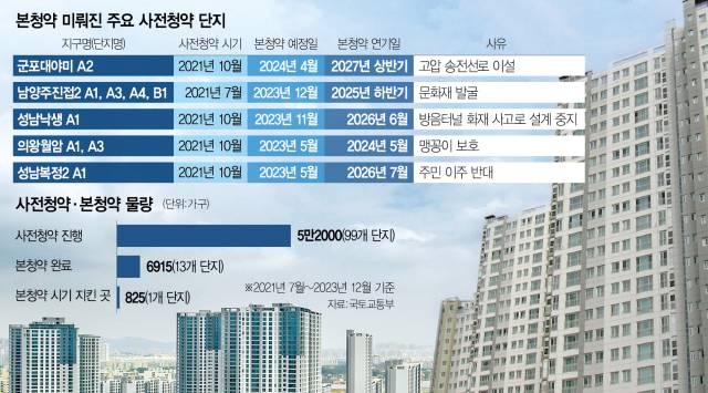 당초 올 4월 본청약 예정이던 경기 군포대야미 A2블록 신혼희망타운의 경우 청약일을 2주 앞두고 본청약이 3년 미뤄진다는 통보를 받았다. 아파트가 들어서는 부지에 특고압 전력선이 지나는 송전선로가 있는데 한전과 협의가 지연되면서 이설하는 공사가 늦어졌기 때문이다. 남양주진접2지구의 경우 청동기시대 주거지와 삼국시대 유물 등이 출토되면서 지난해 12월 예정이던 본청약은 2025년 하반기로 미뤄졌다.