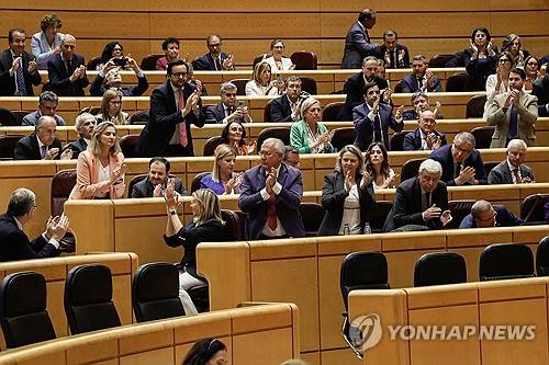 epa11340044 Spanish Popular Party's senators stand in ovation after the approval of their veto to pass the 'Amnesty Law' in the Upper Chamber, in Madrid, Spain, 14 May 2024. The so-called 'Amnesty Law' for Catalan pro-independence parties is to return to Spanish Congress (Lower Chamber) in order to receive the final green light. EPA/FERNANDO ALVARADO