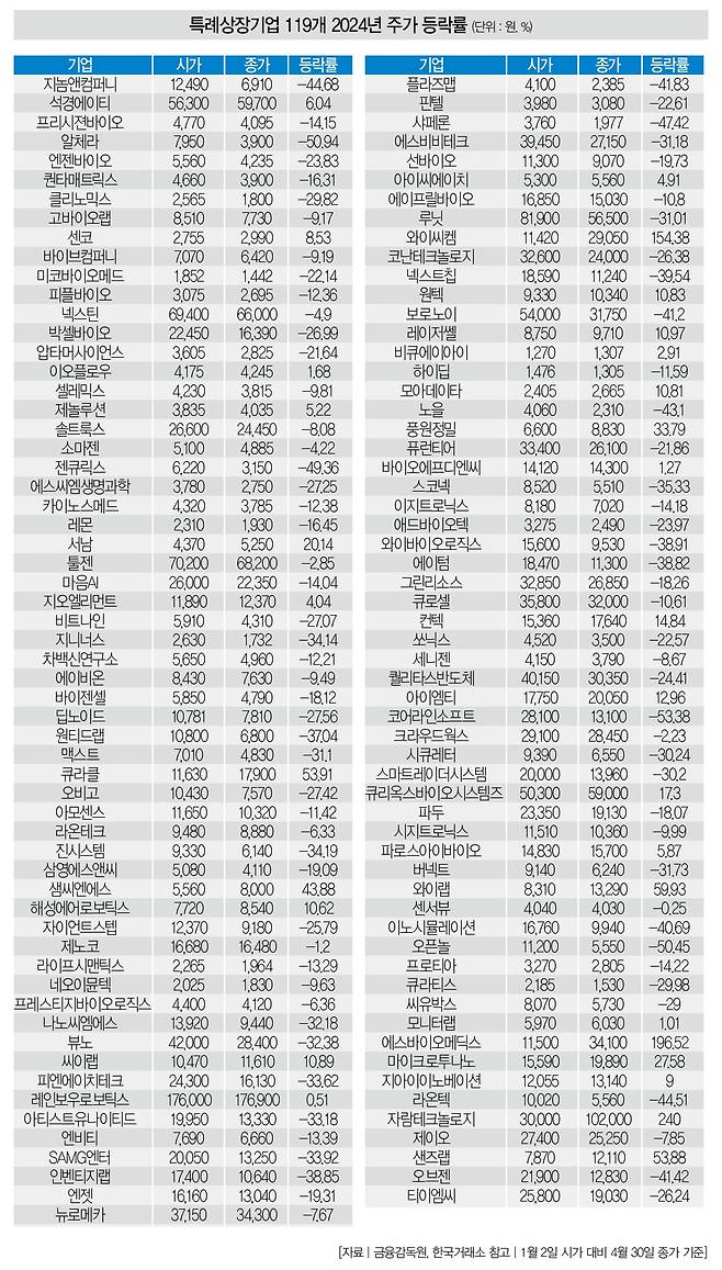 # 그런데 정작 특례를 받은 후 기업가치를 제고하는 데 성공한 기업은 많지 않다. 그러다보니 특례상장기업의 주가는 대부분 기대치를 한참 밑돌았다. 더스쿠프가 최근 4년간(2020~2023년) 특례로 증시에 입성한 119개 기업의 올 1~4월 주가 등락률을 분석한 결과에 따르면, 74.79%에 이르는 89개 기업의 주가가 떨어졌다. 그중 주가가 반토막이 난 기업은 30개나 됐다.