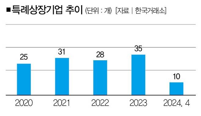 특례상장은 처음 도입했던 2005년엔 활용도가 낮았다. 당시엔 바이오 업종만 신청할 수 있었고, 지금처럼 루트가 여러개도 아니었다. 그러던 2014년 특례상장이 전 업종으로 확대하고, 2016년 상장 방법을 추가하면서 신청 기업이 폭증했다. 그 결과, 2018년 21개, 2019년 22개, 2020년 25개로 늘어나더니 2021년엔 31개 기업이 '특례'로 코스닥에 입성했다. 지난해엔 역대 최다인 35개 기업이 상장했다.