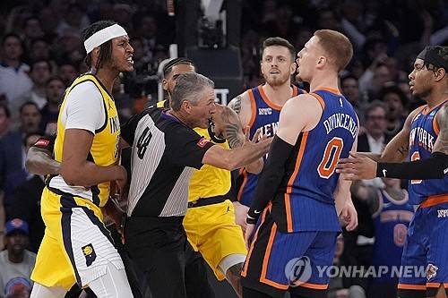 Indiana Pacers' Myles Turner (33) is restrained by officials while exchanging words with New York Knicks' Donte DiVincenzo (0) during the second half of Game 5 in an NBA basketball second-round playoff series, Tuesday, May 14, 2024, in New York. The Knicks won 121-91. (AP Photo/Frank Franklin II)