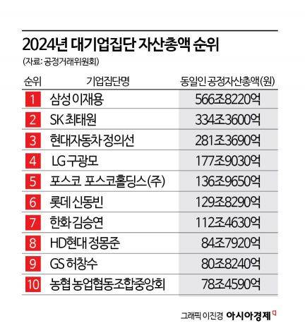 HD현대의 신규 선박 수주에 힘입어 상위 10위권 내 HD현대와 GS가 각각 8위와 9위로 순위가 바뀌었다. GS는 차입금(약 1조1000억원) 상환에 따라 자산총액이 80조8200억원으로 줄었다.