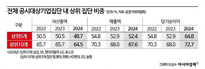 상위 10개 집단의 '부의 독점'은 두드러졌다. 전체 공시대상기업집단에서 상위 10개 집단이 차지하는 비중은 매출액과 자산총액, 당기순이익 기준 모두 60~70% 수준으로 매우 높게 나타났다.