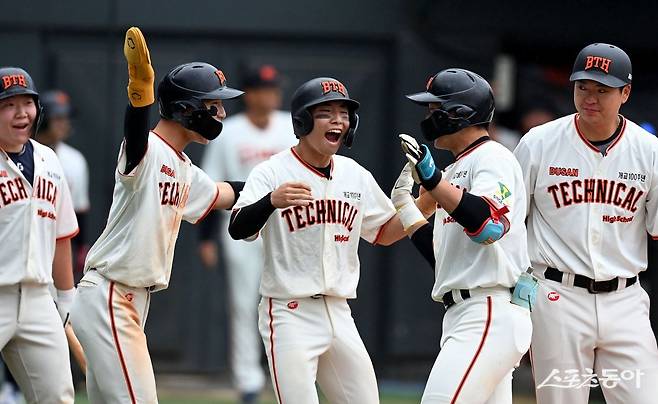 15일 서울 목동야구장에서 ‘제 78회 황금사자기 전국고교야구대회 겸 주말리그 왕중왕전’ 제주고와 부산공고의 경기가 열렸다. 3회말 1사 만루에서 부산공고 배재휘가 만루홈런을 쏘아 올린 후 동료들의 환영을 받고 있다.