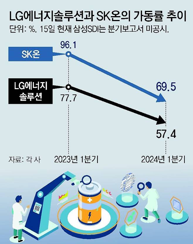 SK이노베이션은 1분기 SK온의 배터리 사업 평균 가동률이 69.5%라고 밝혔다. 지난해 1분기(96.1%)보다 30%포인트 가까이 급락한 것이다. 지난해 전체 가동률은 87.7%였다.