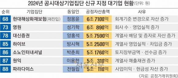 공정위는 15일 이런 내용의 2024년 공시대상기업집단(대기업집단) 및 동일인 지정 결과를 발표했다. 대기업집단이란 자산 총액 5조원을 넘는 기업집단을 가리킨다. 지난해 말 기준 대기업집단은 88개로 전년보다 6개 늘었다.