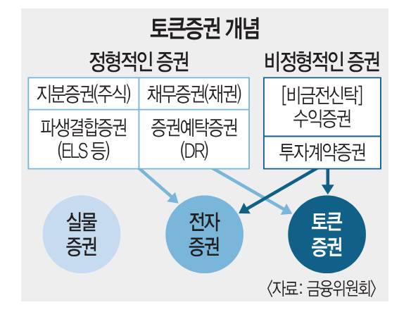 토큰증권은 전통 증권처럼 자금을 조달하는 증권의 한 종류다. 주식 채권 파생결합증권(ELS 등) 증권예탁증권(DR) 등과 다른 점은 부동산이나 미술품, 음원 등에 대한 권리를 전자 증권으로 발행·유통한다는 점이다. 부동산 같은 실물 자산을 신탁업자에게 맡기고 신탁업자가 수익증권을 발행하는 비금전신탁 수익증권, 미술품을 기초자산으로 한 투자계약증권이 이에 해당한다.