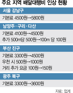 배달대행업체들이 일부 지역에서 일제히 요금을 인상하면서 자영업자들의 부담이 늘고 있다.