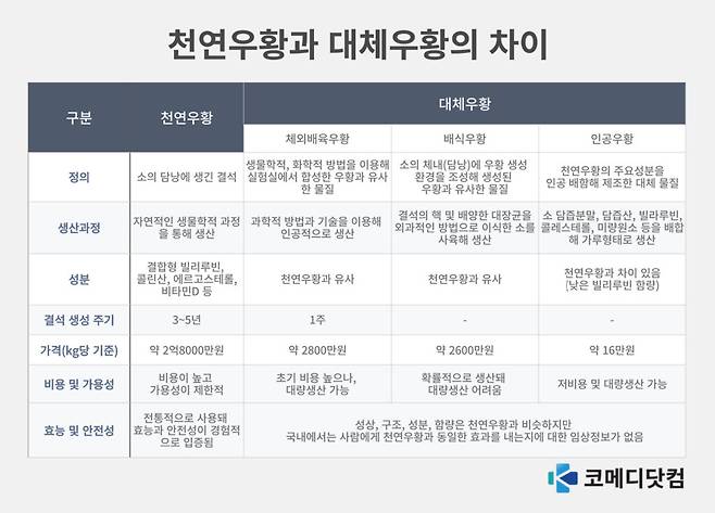 천연 우황이 아닌 불법 우황은 국내 식약처가 인정한 원료가 아니다. 우황은 소의 담낭이나 담관 에 생긴 결석을 건조해 만들어진다. 사료를 먹지 않고, 자연에서 방목해 키운 소에게서만 채취가 가능하다. 하지만 주요 우황 수출국이 농장사육을 늘리는 등 사육 환경이 변하면서 우황 원료를 구하기가 어려워졌다. 우황 가격이 1년 새 2배 이상 뛴 이유기도 하다.