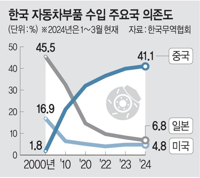 국가별 수입액 비중을 보면 중국은 올해 처음으로 40%대(41.1%)를 넘었다. 중국 자동차부품 수입 의존도는 지난 2000년 1.8%에 불과했지만 2010년 21.1%, 2020년 32.0%에 이어 매년 큰 폭으로 오르고 있다. 반면 2000년 45.5%에 달했던 일본 자동차부품 수입 의존도는 올해 1분기 6.8%까지 위축됐다.