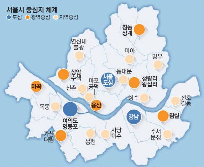 서울은 크게 5개 권역(동북·서북·서남·동남·도심권)으로 나뉘기도 한다. 2040 서울플랜에선 각 권역 거점을 1~2곳 정해 '광역 중심'으로 정해뒀다. 용산, 청량리·왕십리, 창동·상계, 상암·수색, 마곡, 가산·대림, 잠실이 그 대상이다. 이 7개 지역이 3개 도심 다음으로 위계가 높다.