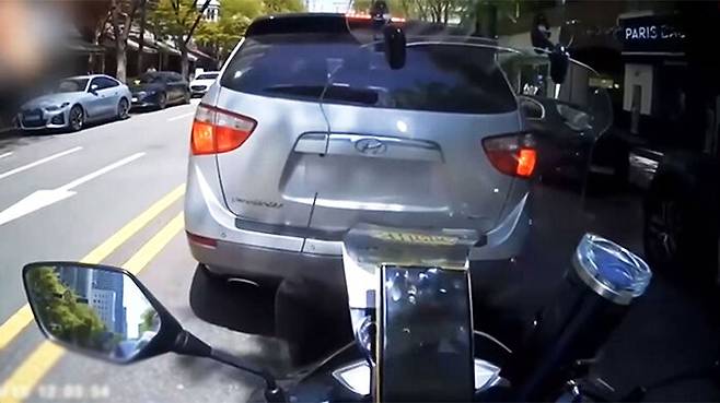 그런데 2차로에는 차량들이 줄지어 주차돼 있었고 결국 오토바이는 1차로와 2차로 사이를 주행하기 시작하는데요.