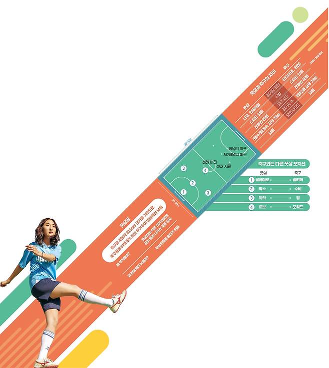 전개 속도도 빠르다. 전반 20분, 하프 15분, 후반 20분 구성으로 한 시간 안에 한 경기를 치른다. 축구에 비해 경기장과 골대가 작고 선수 수도 적다 보니 공격과 수비 전환이 쉼 없이 이뤄진다. 좁은 경기장을 쉴 틈 없이 달리다 보면 초심자는 10분을 온전히 뛰기에도 버거울 수 있다.