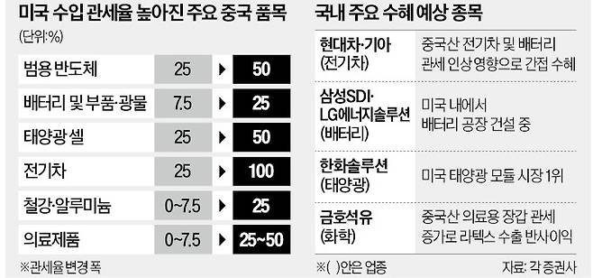 미국이 전기차·배터리를 비롯한 중국 제품의 관세율을 대폭 높이기로 결정하자 투자자들이 수혜주 찾기에 분주하다.