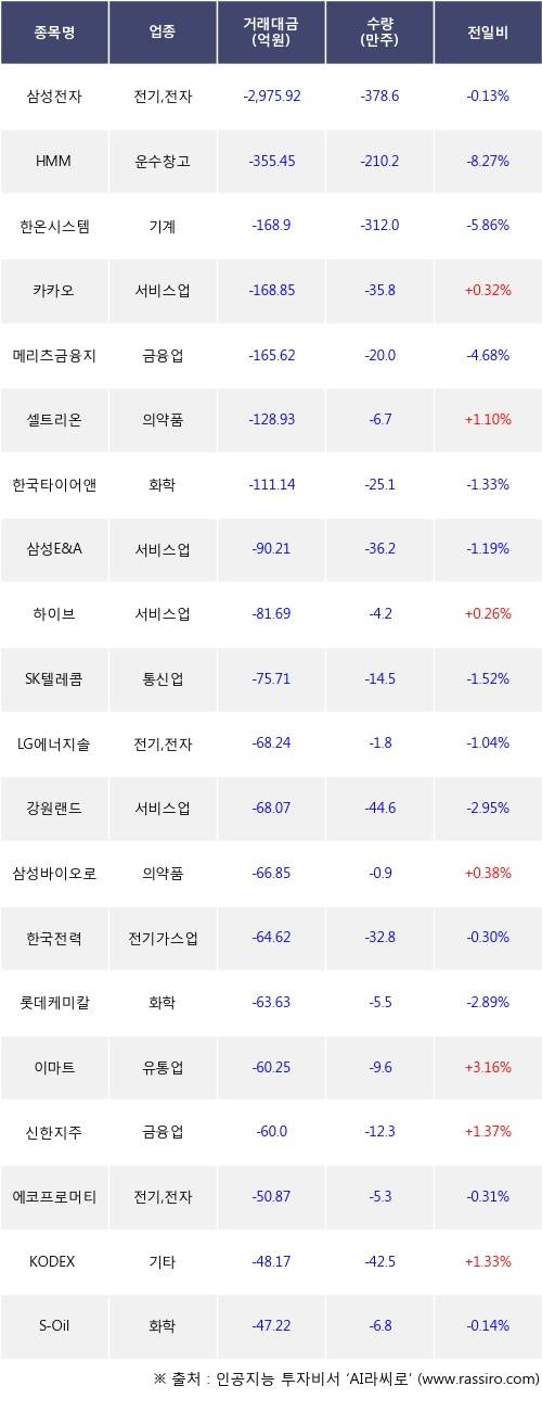 외국인 투자자의 순매도 상위 20개 종목은 삼성전자, HMM, 한온시스템, 카카오, 메리츠금융지주, 셀트리온, 한국타이어앤테크놀로지, 삼성E&A, 하이브, SK텔레콤등이다.