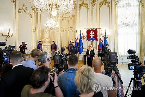 Slovakia's incumbent President Zuzana Caputova, right, and President elect Peter Pellegrini hold a joint press conference at the presidential palace in Bratislava, Slovakia, Thursday, May 16, 2024. Slovak Prime Minister Robert Fico was in serious but stable condition Thursday, a hospital official said, after the populist leader was shot multiple times in an assassination attempt that shook the small country and reverberated across the continent weeks before European elections. (AP Photo/Petr David Josek)