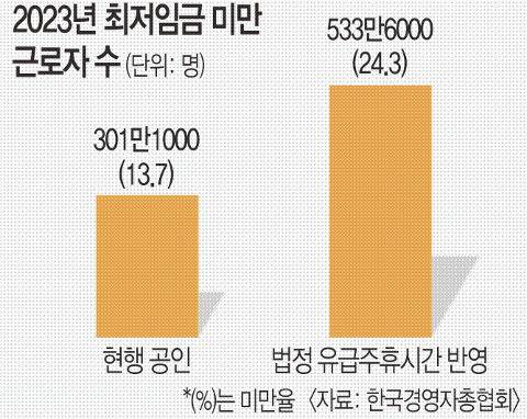 경총이 새롭게 계산한 방식에 따르면 지난해 최저임금 미만자 수는 533만6000명, 미만율(전체 임금근로자 중 최저임금 미만의 시간당 임금을 받는 근로자 비중)은 24.3%에 달했다.