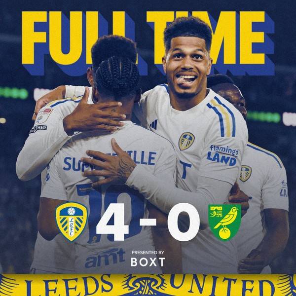 17일(한국시간) 영국 리즈에 위치한 엘런드 로드에서 2023-2024 잉글랜드 챔피언십(2부) 플레이오프 준결승 2차전을 치른 리즈가 노리치시티를 4-0으로 제압했다.