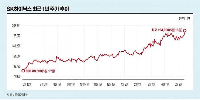 삼성전자의 주가는 5월 14일 7만8300원으로 거래를 마쳤다. 5월 7일 8만1300원까지 올랐으나 최근 일주일 새 3.69% 하락하며 다시 7만원대로 내려앉았다. 반면 SK하이닉스는 14일 18만5300원을 기록하며 일주일 전보다 4.1% 올랐다.