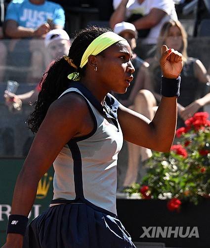(240517) -- ROME, May 17, 2024 (Xinhua) -- Coco Gauff celebrates a point during the women's singles semifinal match between Iga Swiatek of Poland and Coco Gauff of the United States at the WTA Italian Open in Rome, Italy, May 16, 2024. (Photo by Alberto Lingria/Xinhua)