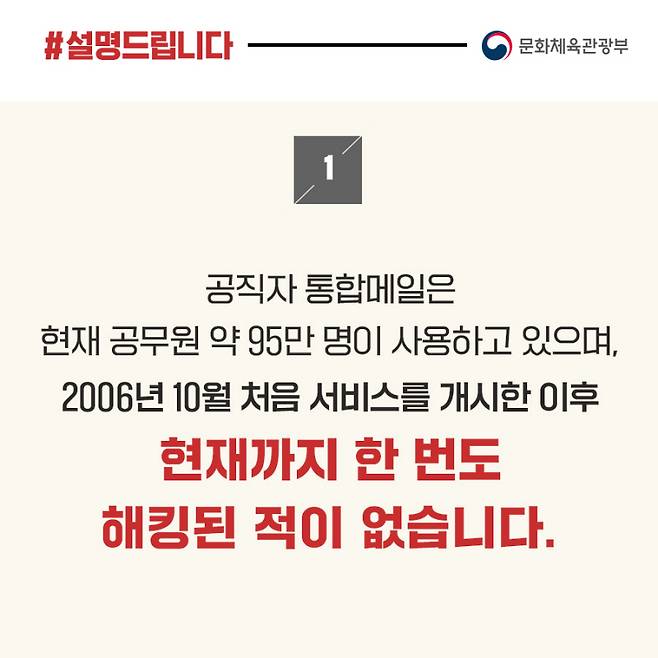 □ 문화체육관광부(이하 문체부)가 관리하고 있는 공직자 통합메일(mail.korea.kr)은 현재 공무원 약 95만 명이 사용하고 있으며, 2006년 10월 처음 서비스를 개시한 이후 현재까지 해킹사고는 한 번도 발생한 적이 없습니다.