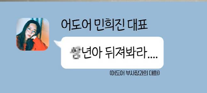 이진호는 "민희진 대표가 기자회견에서 '개저씨' 발언으로 여성들의 많은 지지를 받았다. 사회적인 갈라치기다. 민희진 대표가 평소 여성들을 보는 시선은 어땠을까. '개저씨'에 대한 사회적인 분노를 표했는데 민대표의 여성에 대한 시각이 어땠는지 알아봐야하지 않나. 법정에서 공개된 자료인데 민희진 측에서 요청해서 모자이크 됐다. 그 카톡을 재구성 했다. 멘트 자체는 있는 그대로 민희진 대표의 워딩을 담았다"고 말했다.