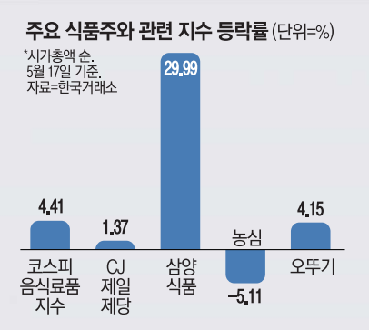이재원 신한투자증권 연구원은 “삼양식품의 불닭볶음면이나 빙그레의 바나나맛우유 등 K컬쳐 수혜를 받는 제품들의 해외 매출이 증가 추세다”라며 “검은 반도체 ‘김’ 매출 역시 증가하면서 수출 중심 음식료주 전반이 강세를 보였다”고 설명했다.