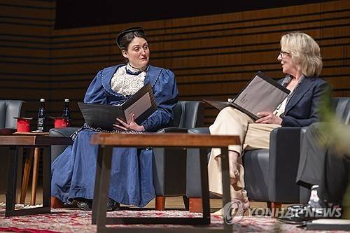 IMAGE DISTRIBUTED FOR RENSSELAER POLYTECHNIC INSTITUTE – Liz Wisan as Emily Warren Roebling and Provost Rebecca Doerge at Rensselaer Polytechnic Institute's Bicentennial Colloquy on Friday, May 17, 2024 in Troy, New York. (Peter Barreras/AP Content Services for Rensselaer Polytechnic Institute) THIS PHOTO WAS TAKEN BY AP IMAGES FOR RENSSELAER POLYTECHNIC INSTITUTE