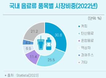 특히 국내 전체 음료 시장의 절반 이상을 커피와 탄산음료가 차지하며, 이중 탄산음료의 비중은 25.5%에 달한다.