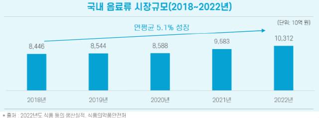 aT 한국농수산식품유통공사 식품산업통계정보시스템 5월 2주 차 자료에 따르면 2022년 국내 음료류 시장 규모는 10조3210억 원으로 전년 대비 7.6% 증가, 2018년 이후 연평균 5.1%로 지속적인 성장세를 보이고 있다.