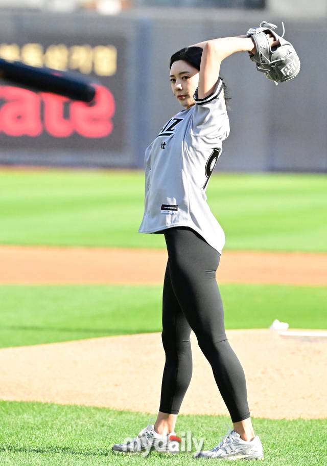 [마이데일리 = 수원 곽경훈 기자] 18일 경기도 수원 KT위즈파크에서 진행된 '2024 신한 SOL 뱅크 KBO 리그' LG-KT의 경기. 피지컬 100 출연자 육상선수 김지은이 경기 전 시구를 하고 있다.