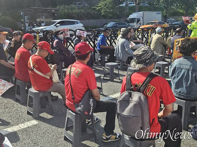 집회가 시작하자 정의자유해병연대 소속 회원들은 빨간색 해병대 티와 모자를 쓰고 모여 앉았다. 채상병 특검법에 대한 참석자들의 발언에는 고개를 끄덕이기도 하고 박수를 치기도 했다.