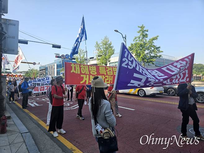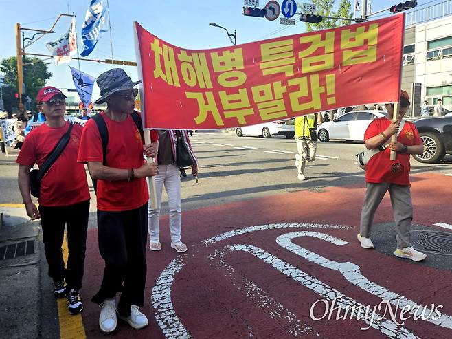 '채해병 특검법 거부말라!'라는 글자가 담긴 플래카드를 들고 행진하던 정의자유해병연대 회원 김영우(57, 병 579기)씨는 <오마이뉴스>와 만나 "어제도 박정훈 대령의 4차 공판 전 응원 기자회견에 참석했다"며 "현재 임성근 사단장이 본인의 죄를 회피하고 있는데 진실을 밝혀 억울하게 죽은 채상병이 마음 편히 떠날 수 있길 바라는 마음"이라고 전했다.