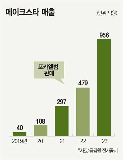 최근 3년 새 판매량이 급속히 늘면서 누적 300만장 판매고를 올린 회사가 있다. 글로벌 K굿즈 스타트업 ‘메이크스타’다. 포카앨범 히트 덕에 이 회사 성장세도 뚜렷하다. 2019년 매출액 40억원이었던 이 회사는 포카앨범 판매가 시작된 2022년 매출액 479억원을 기록하더니 지난해에는 956억원으로 껑충 뛰었다. K컬처 기반 스타트업으로서는 드물게 3년 연속 흑자 행진도 이어가고 있다.