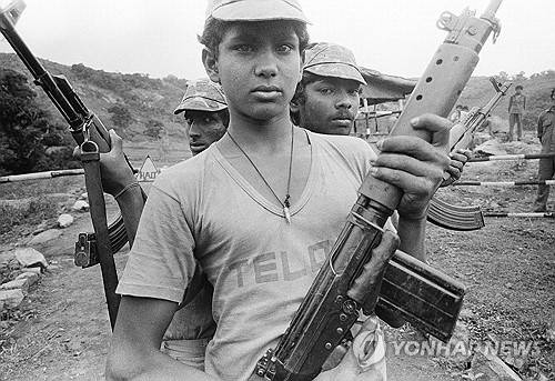 FILE- Three Tamil teenagers pose with their weapons a week before going for training in a camp in southern India, Nov. 10, 1986. (AP Photo/Liu Heung Shing, File)wld NOV. 10, 1986 FILE PHOTO