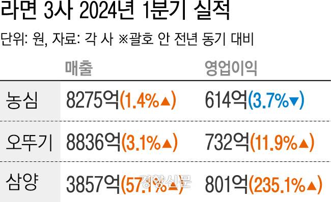 19일 관련 업계에 따르면 삼양식품의 올해 1분기 영업이익은 801억원으로 지난해 같은 기간보다 무려 235.1%나 증가했다. 반면 농심은 3.7% 감소한 614억원의 영업이익을 올렸고, 오뚜기는 12.0% 증가한 732억원이었다. 삼양식품 실적 발표 직후 증권사들은 “상상도 못 한 실적” “음식료 업종 희대의 서프라이즈” 등 이례적인 반응을 쏟아냈다.