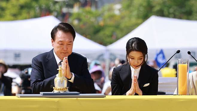 윤 대통령 내외, 사리 반환 기념식 참석…"조계종서 김 여사 참석 당부"