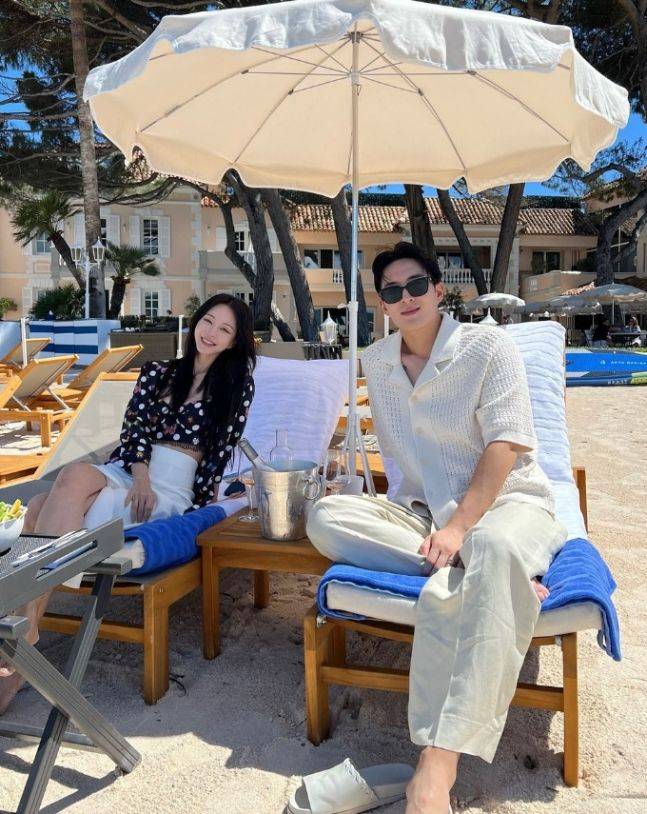 한예슬은 19일 인스타그렘에 휴양지 바닷가에서 남편과 함께 선베드에 앉아 있는 사진을 올리고 "내가 제일 좋아하는 사람"이라는 글을 썼다.