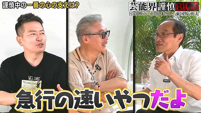 16일(현지 시간) 배우 겸 개그맨 미야사코 히로유키(54)가 자신의 유튜브 채널에 "연예계 BIG3와 프리 토크를 했더니 큰일 났습니다"라는 제목의 영상을 올렸다. 영상에는 개그맨 타시로 마사시(67)와 정치인 겸 정치인 히가시 고쿠마루 히데오(66)가 출연해 미야사코 히로유키와 이야기를 나누는 모습이 그려졌다.