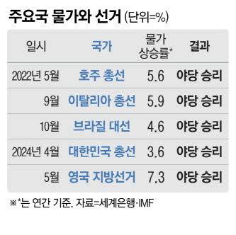 19일 매일경제신문이 2022년부터 올 상반기까지 주요국 선거 결과를 분석한 결과, 물가와 높은 상관관계를 보이면서 사실상 고물가와 저성장에 대한 심판이 글로벌 선거를 좌우한 것으로 확인됐다.