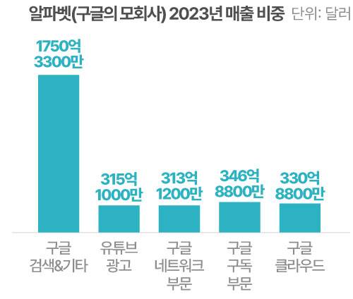 구글의 매출 구조를 보면, 구글의 검색·광고 부문은 전체 매출의 절반 이상을 담당하고 있어요. 금액은 1750억 달러(약 240조원)에 달해요. 인터넷 검색 광고 수익이 여전히 구글을 먹여 살리고 있는 셈이에요. 구글의 ‘검색 왕국’이 흔들리면, 기업 전체가 어려움을 겪을 수도 있다는 뜻이기도 하고요.
