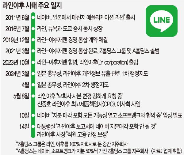 그러던 차에 지난해 11월 네이버 클라우드가 사이버 공격으로 악성코드에 감염돼 일부 내부 시스템을 공유하던 라인야후에서 약 52만건의 개인정보 유출 사건이 발생했다. 일본 총무성은 올해 3월과 4월 두 차례 행정지도를 통해 라인야후에 자본 관계 재검토를 포함한 경영체제 개선을 요구하면서 이 사태가 불거졌다.